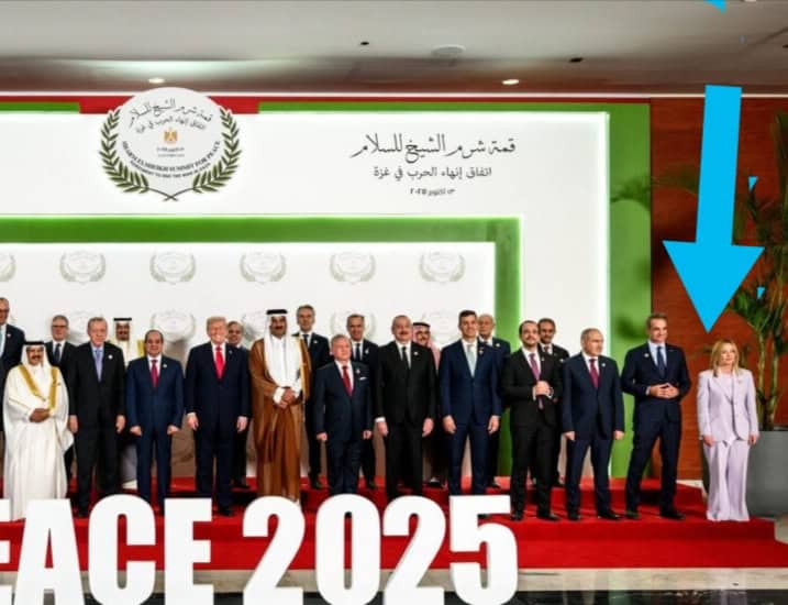 Vertice di Sharm, foto ufficiale: i grandi del mondo al centro a parlare di sbembli (spoilerone: dei gazawi frega cazzi a nessuno) e Meloni al margine come la pianta ornamentale per antonomasia. L’immagine perfetta dell’Italia di oggi: sempre pronta per la fotina, anche quando ti mettono così di lato che serve un fish-eye.